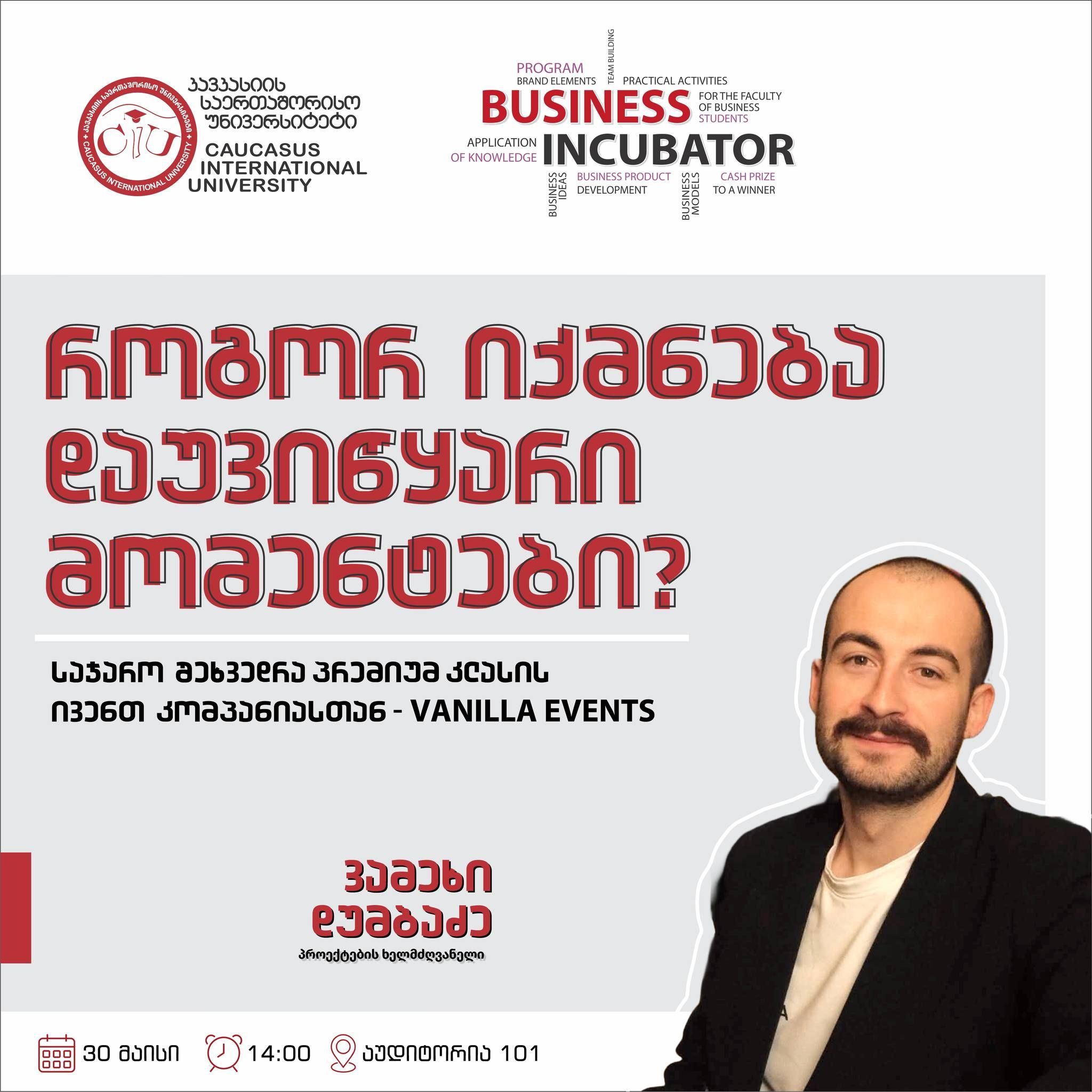 5 დეკემბერი, 13:00 საათი, აუდიტორია 101. კავკასიის საერთაშორისო უნივერსიტეტის უწყვეტი განათლებისა და კარიერული განვითარების სამსახურის ორგანიზებით, გაიმართება მასტერკლასი თემაზე: "ბრენდი, რომელიც შენშია: თვითპრეზენტაციის მნიშვნელობა გასაუბრებისას";